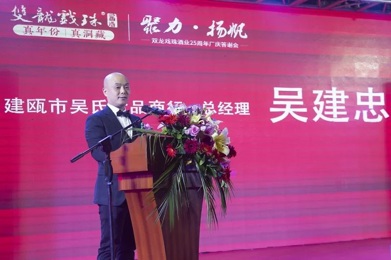 12月12日,雙龍戲珠酒業(yè)25周年廠慶答謝宴建甌站第二場(chǎng)暨雙龍戲珠首屆民間最牛品酒師建甌賽區(qū)半決賽在建甌市福興福大酒店隆重舉行。雙龍戲珠酒業(yè)總經(jīng)理黃盛堯、建甌市吳氏兄弟食品商行總經(jīng)理吳建忠出席活動(dòng)并致辭。