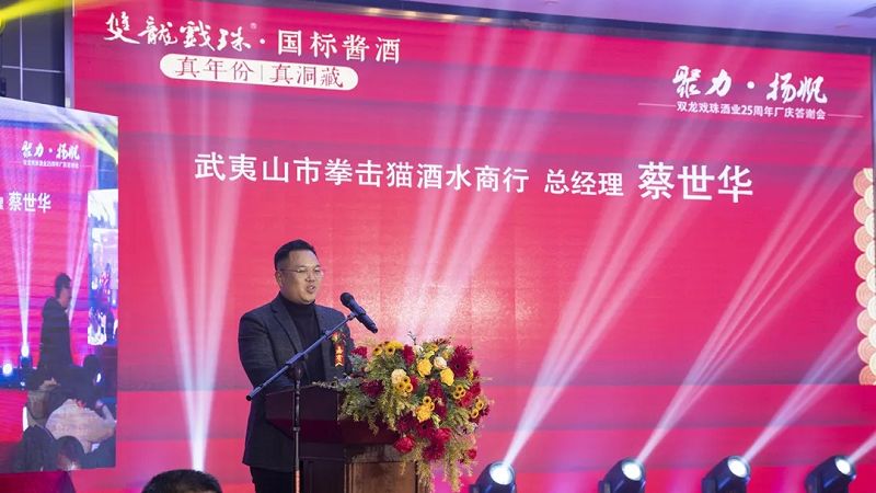 12月19日,雙龍戲珠酒業(yè)25周年廠慶答謝宴(武夷山站)暨雙龍戲珠首屆民間最牛品酒師武夷山賽區(qū)半決賽在武夷山市富貴武夷大酒店隆重舉行。雙龍戲珠酒業(yè)總經(jīng)理黃盛堯、武夷山市拳擊貓酒水商行總經(jīng)理蔡世華出席活動(dòng)并致辭。