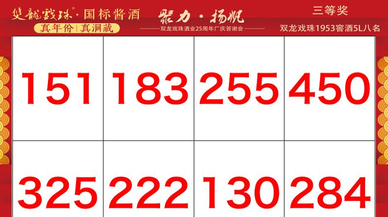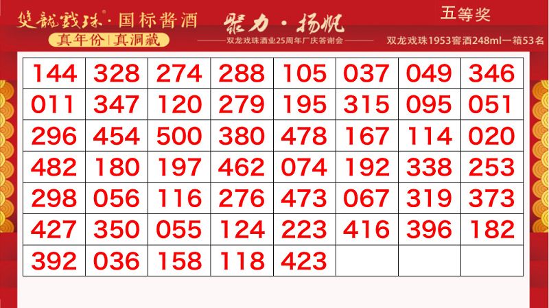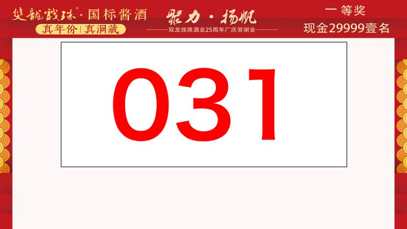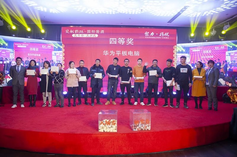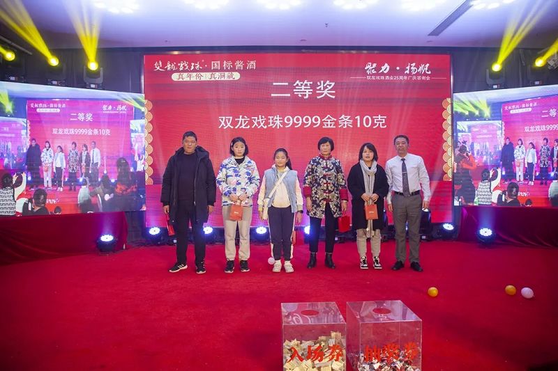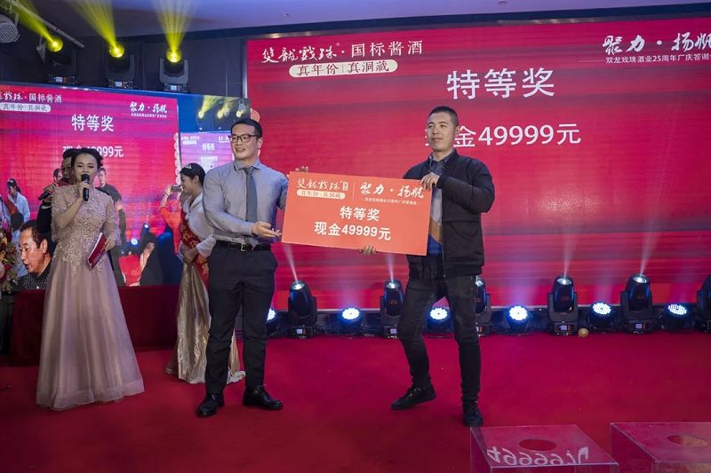 本場(chǎng)答謝宴共誕生特等獎(jiǎng)(49999元現(xiàn)金)得主1位、一等獎(jiǎng)(29999元現(xiàn)金)得主1位、二等獎(jiǎng)(雙龍戲珠9999金條10克)得主5位、三等獎(jiǎng)(5L雙龍戲珠1953洞藏窖酒)得主8位、四等獎(jiǎng)(華為平板電腦壹臺(tái))得主30位、五等獎(jiǎng)(雙龍戲珠1953窖酒248ml壹箱)得主53名。
