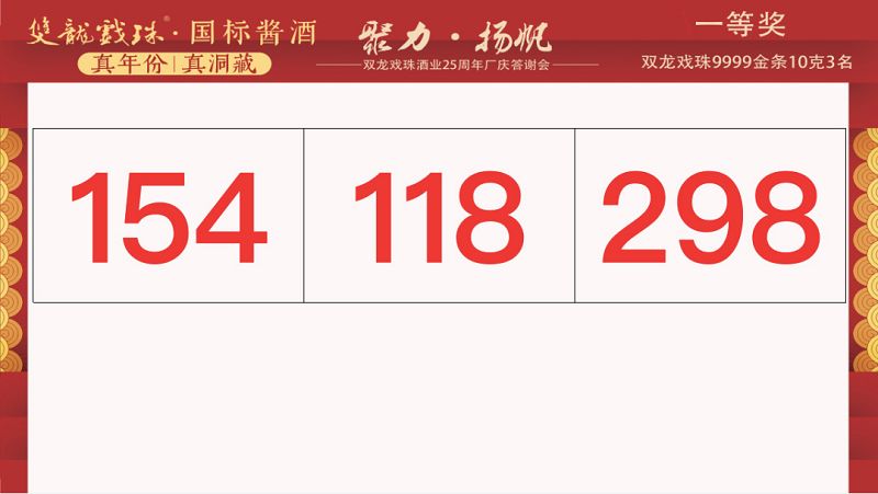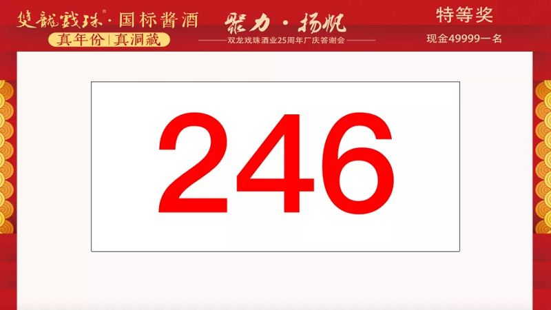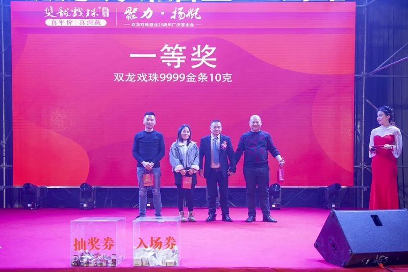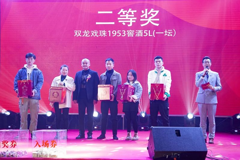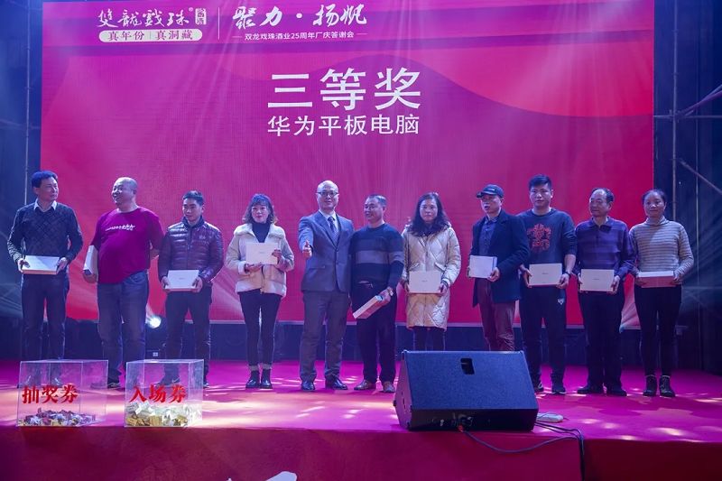 本場(chǎng)答謝宴共誕生特等獎(jiǎng)(49999元現(xiàn)金)得主1位、一等獎(jiǎng)(雙龍戲珠9999金條10克)得主3位、二等獎(jiǎng)(5L雙龍戲珠1953洞藏窖酒)得主5位、三等獎(jiǎng)(華為平板電腦壹臺(tái))得主20位、四等獎(jiǎng)(雙龍戲珠1953窖酒248ml壹箱)得主30名。