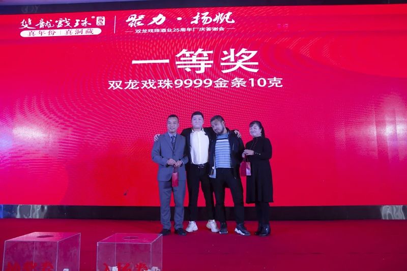 本場答謝宴共誕生特等獎(jiǎng)(49999元現(xiàn)金)得主1位、一等獎(jiǎng)(雙龍戲珠9999金條10克)得主3位、二等獎(jiǎng)(5L雙龍戲珠1953洞藏窖酒)得主5位、三等獎(jiǎng)(華為平板電腦壹臺(tái))得主20位、四等獎(jiǎng)(雙龍戲珠1953窖酒248ml壹箱)得主30名。