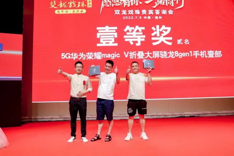 在每輪節(jié)目過后,現(xiàn)場都抽取了幸運觀眾并送出重磅大獎,榮耀折疊屏手機、10克雙龍戲珠金條、華為手表、2.5L1985醬酒壇酒,更有49999元現(xiàn)金大獎!五輪的抽獎環(huán)節(jié)將現(xiàn)場氣氛推向了最高潮。